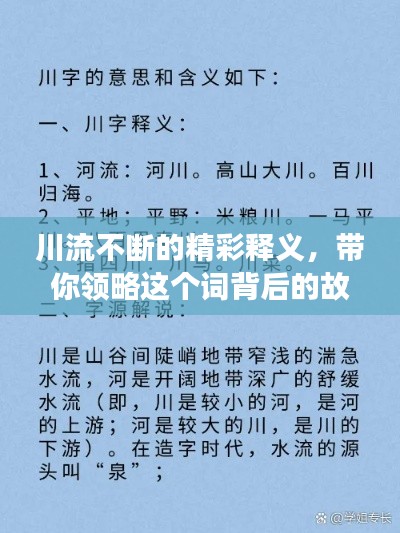 “川流不断”的意思并不仅仅是字面的河水流淌,更是一种富有哲理和诗意的表达方式,它提醒我们,人生就像一条河流,需要不断地流动、不断地进步,才能抵达人生的彼岸,在这个过程中,我们应该保持积极的态度,勇敢地面对挑战,努力实现人生的价值。